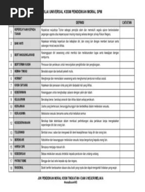 18 nilai universal kssm pendidikan moral spm bil nilai definisi 1. ٦ ذو الحجة ١٤٤٣ هـ. 18 nilai universal kssm pendidikan moral spm · 5 hemah tinggi beradab sopan dan berbudi pekerti mulia. Kepercayaan kepada tuhan keyakinan wujudnya tuhan sebagai pencipta alam . Add to my workbooks (28)